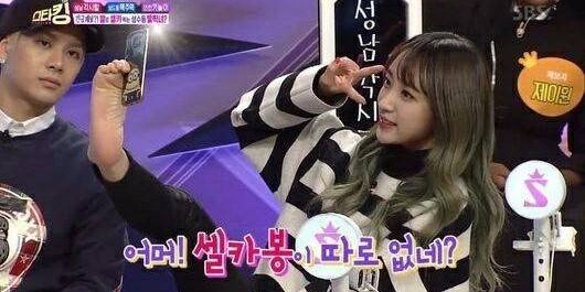 Tidak hanya bercerita tentang cara selfie uniknya itu, Hani ternyata juga mendemonstrasikannya di dapan para bintang tamu dan penonton dengan mengambil foto bareng MC Kang Ho Dong dan Leeteuk.